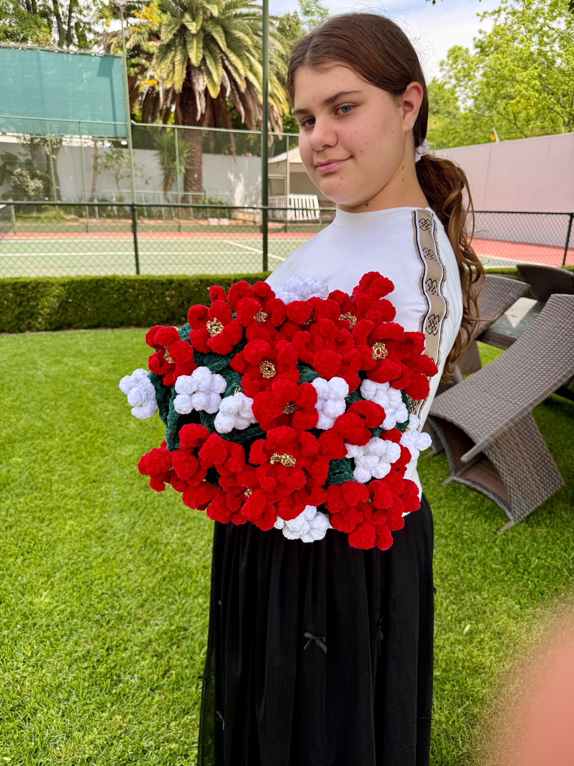 Each piece is crafted from ultra-soft velvet yarn, featuring plush red and white crochet flowers — all handmade with love and care.